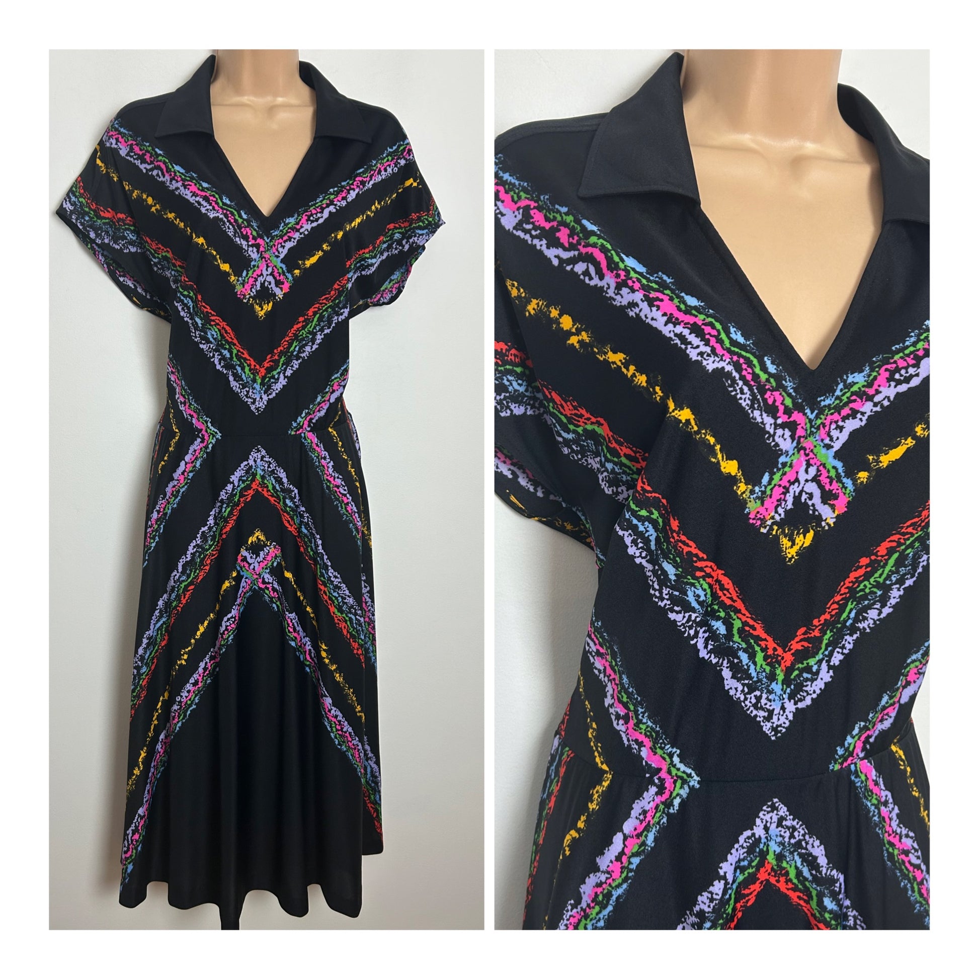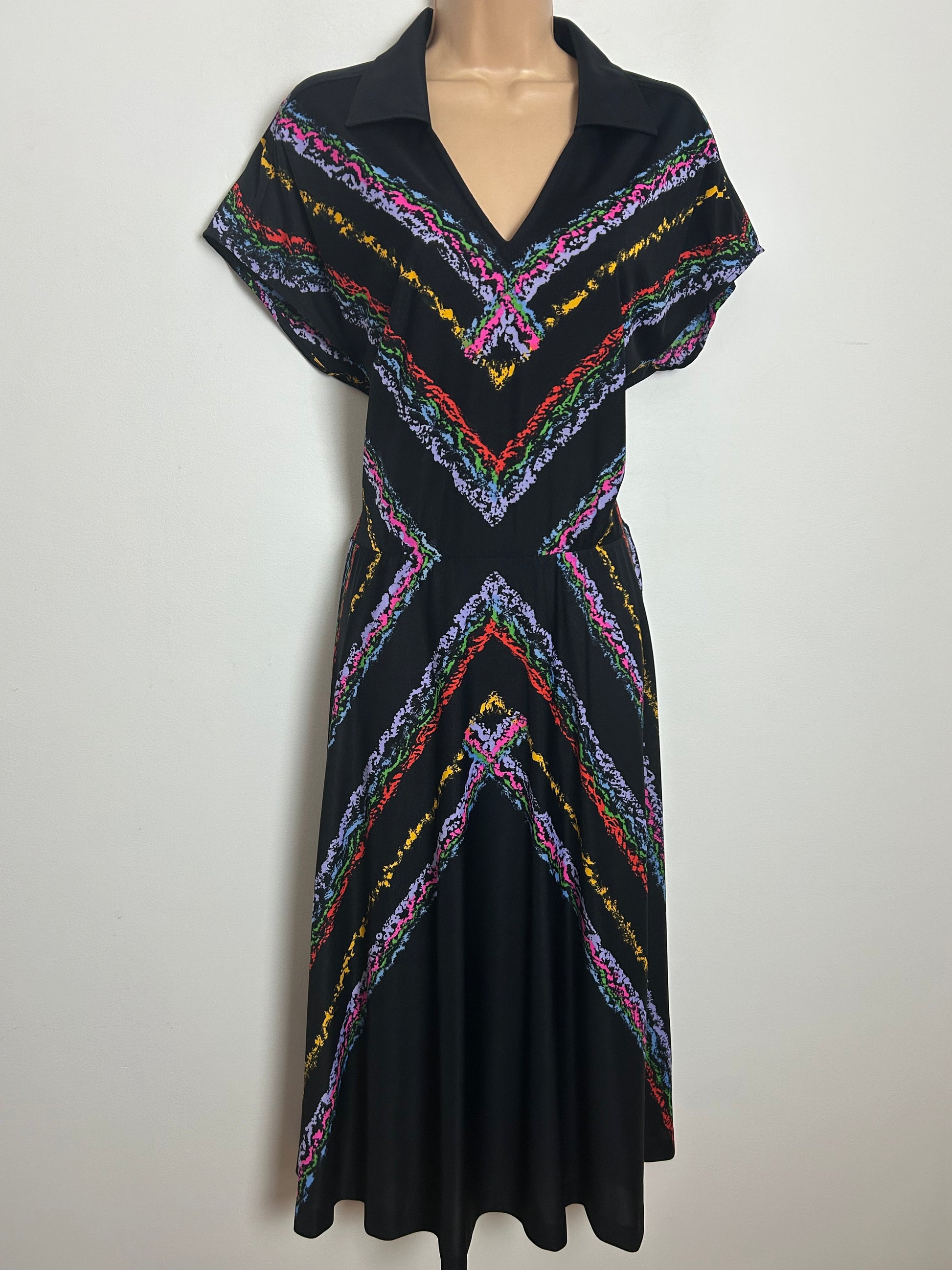 Vintage Early 1980s ELLE Size 10-12 Black Multicolour Chevron Stripe Day Dess