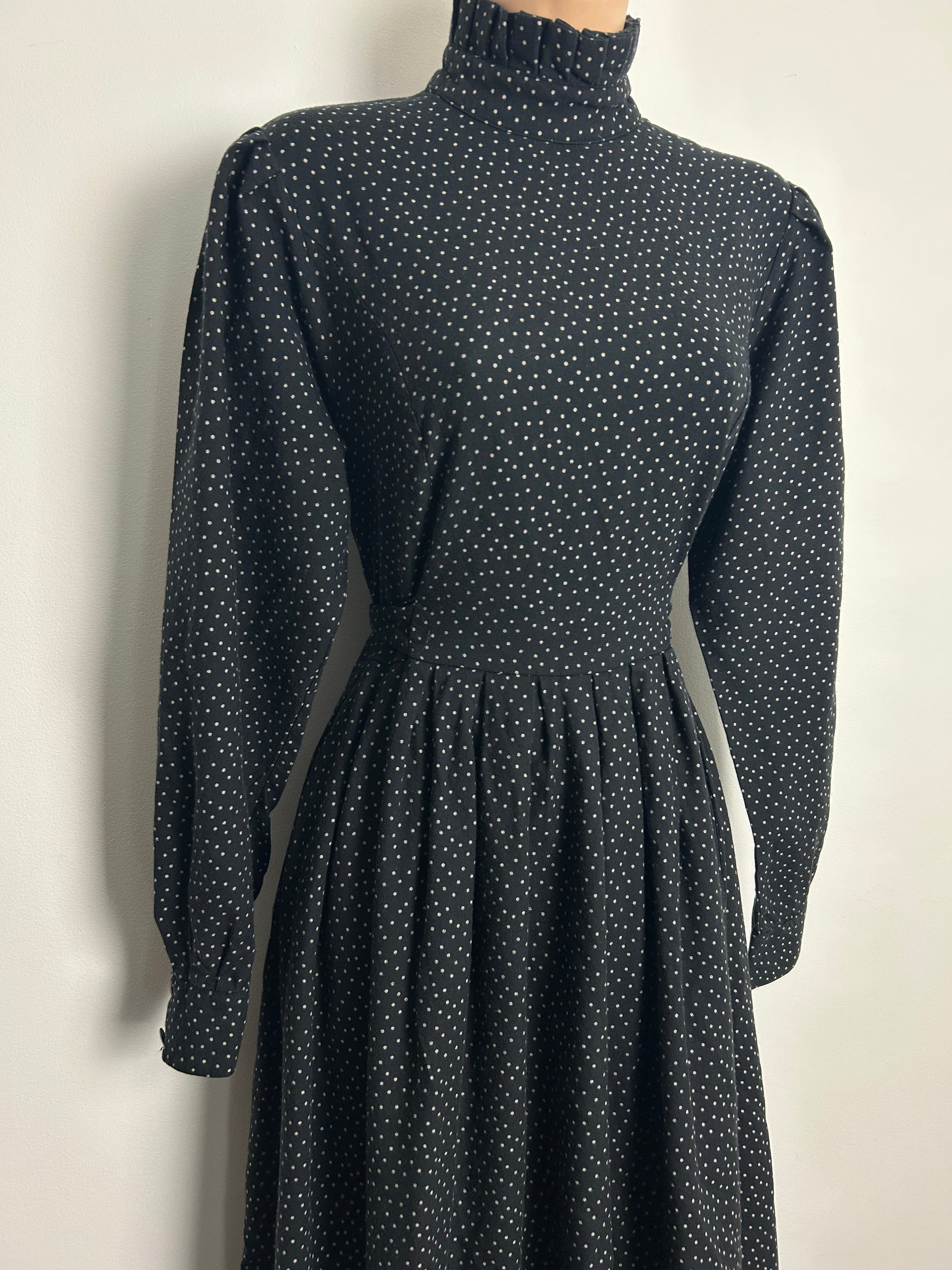 Vintage Early 1980s LAURA ASHLEY Size 12/14 (14 On Label) Black Polka Dot Tie Back Wool Mix Midi Dress