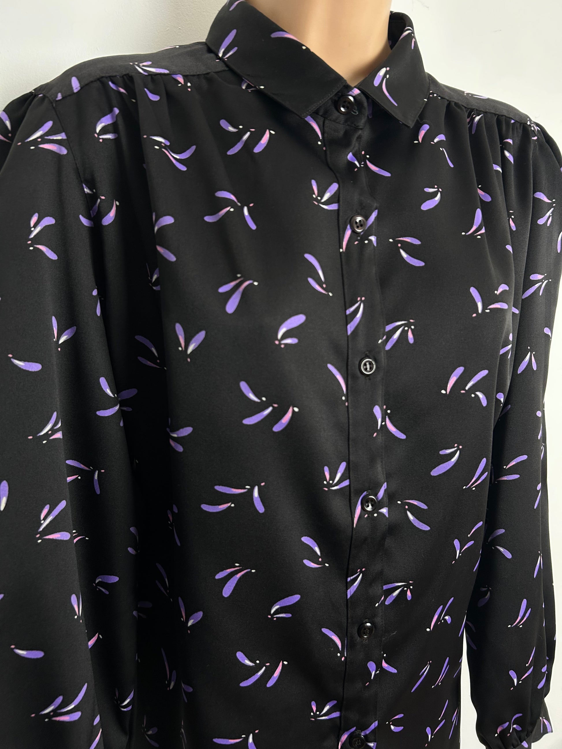 Vintage Early 1980s Size 16-18 Black Lilac & Pink Petal Print Long Sleeve Shirt