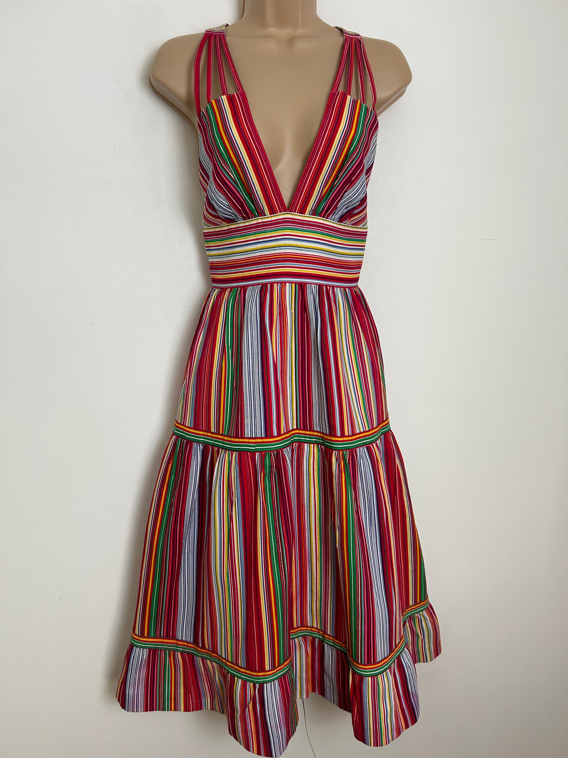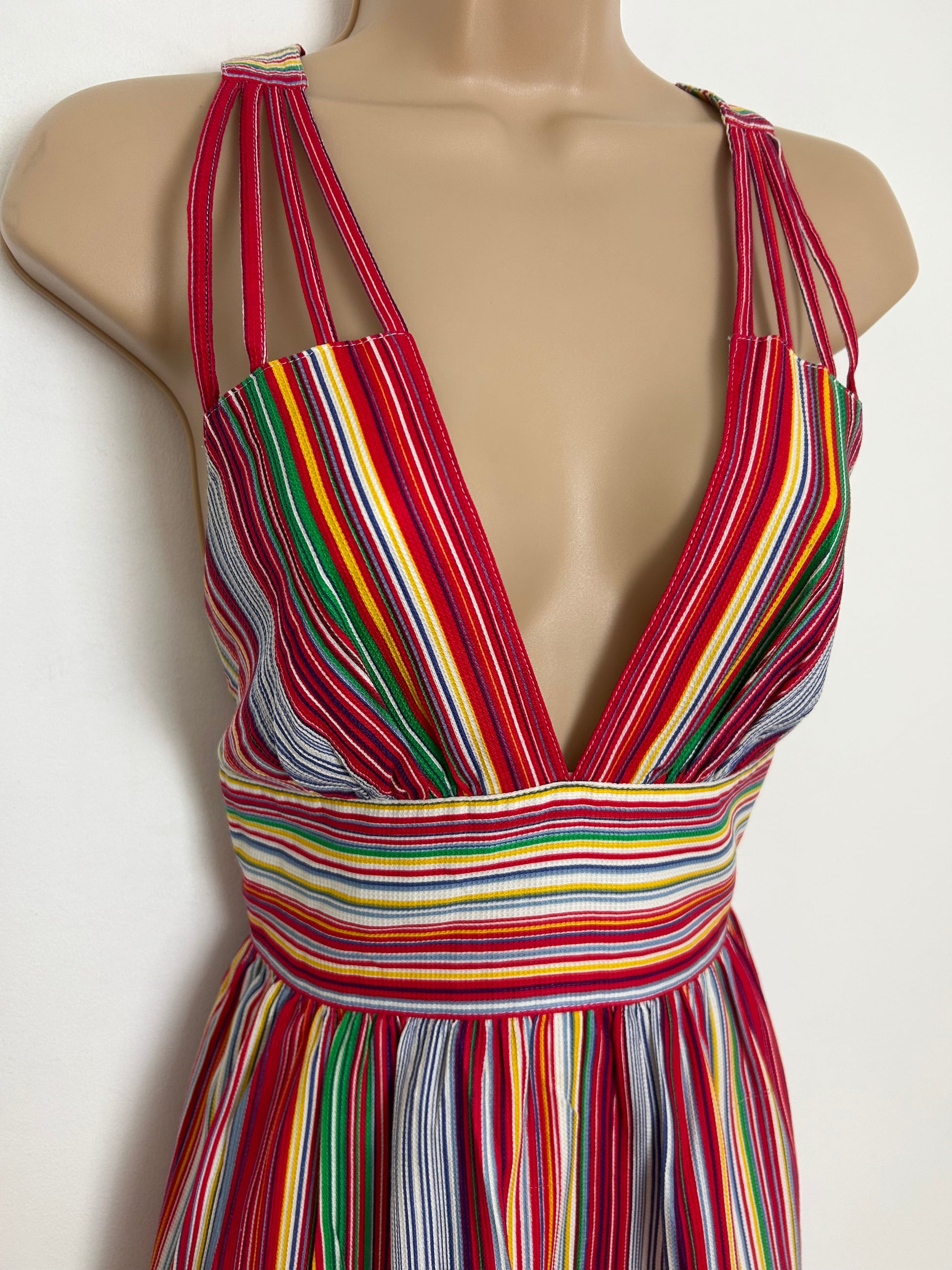 Vintage Late 1970s Size 6-8 Multi Stripe Cross Strap Plunge Neck Summer Sundress