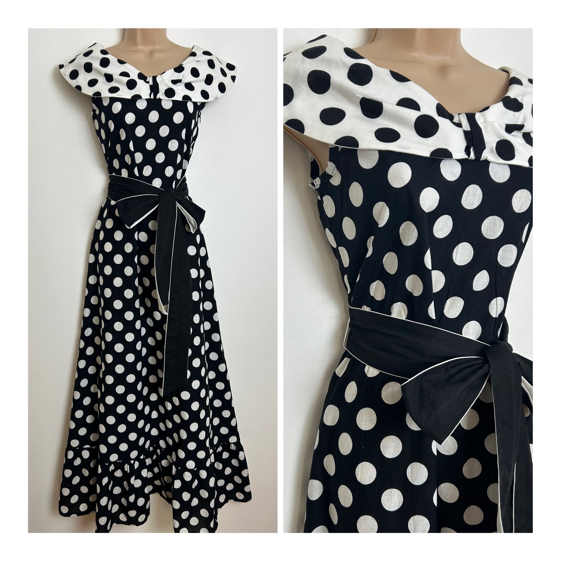 Vintage Early 1980s Size 8 Black & White Spot Print Bardot Style Belted Cotton Summer Maxi Dress