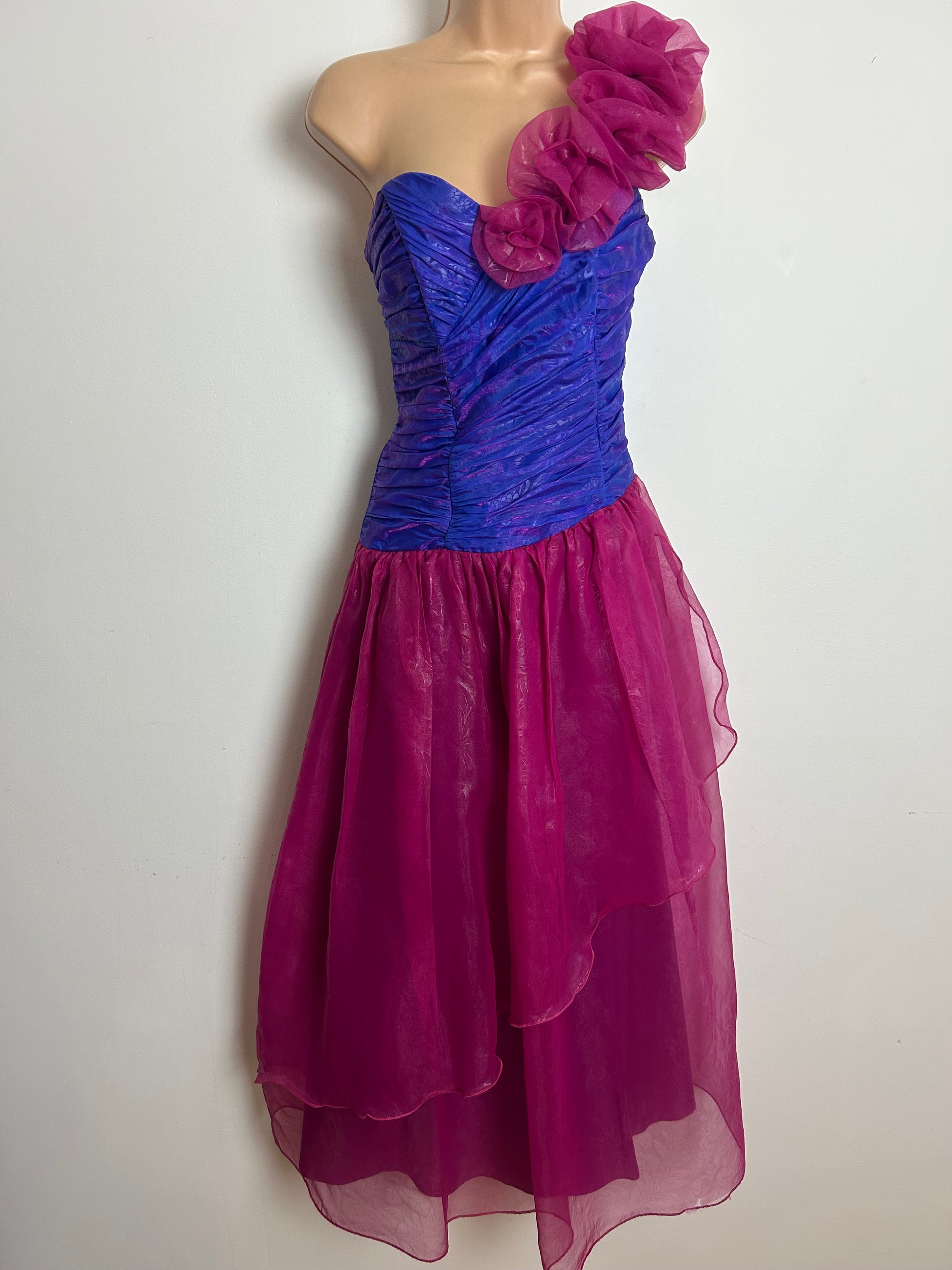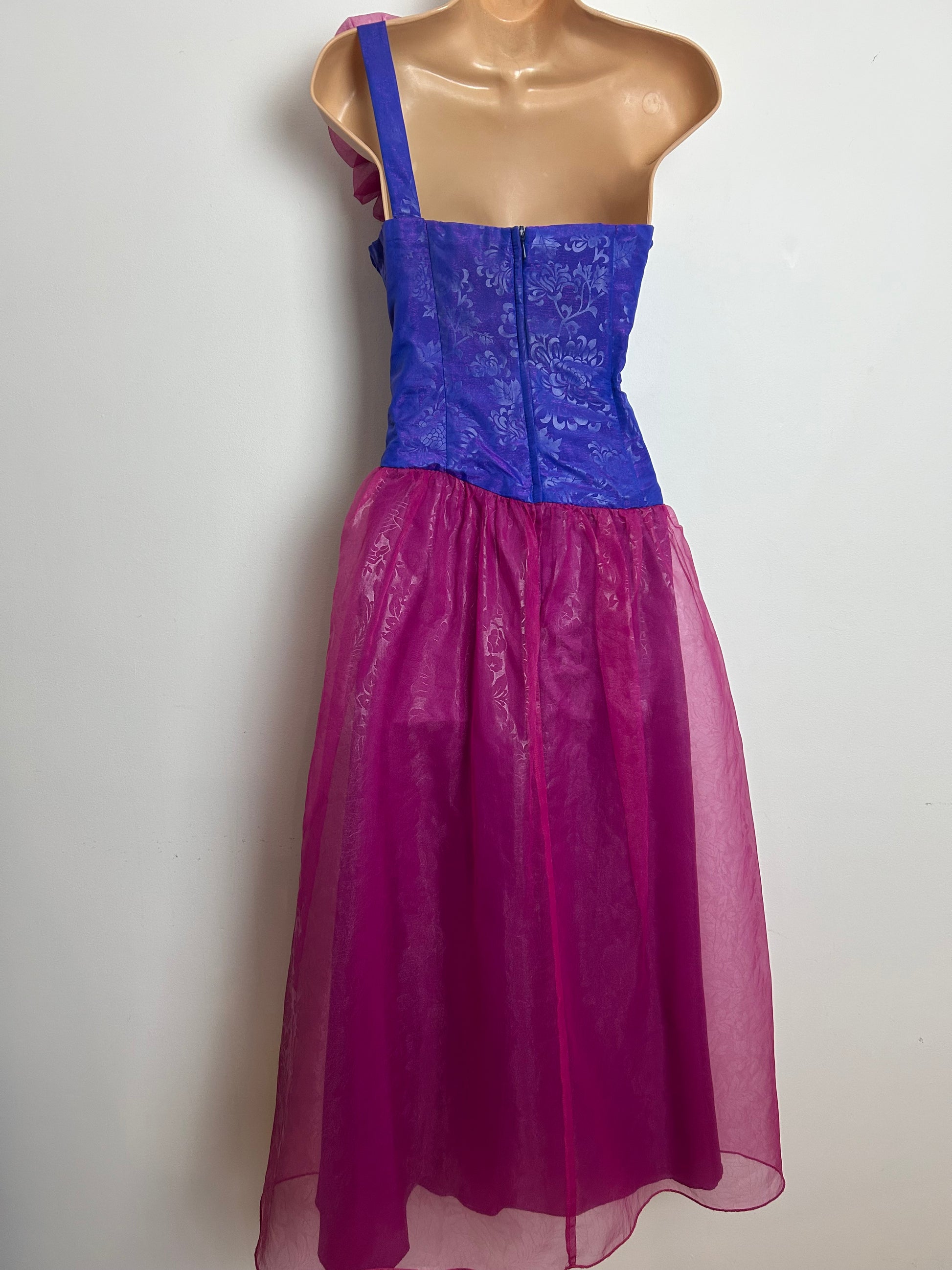 This fab extreme 80s party/prom dress is made from a chiffon & taffeta fabric in purple and pink.