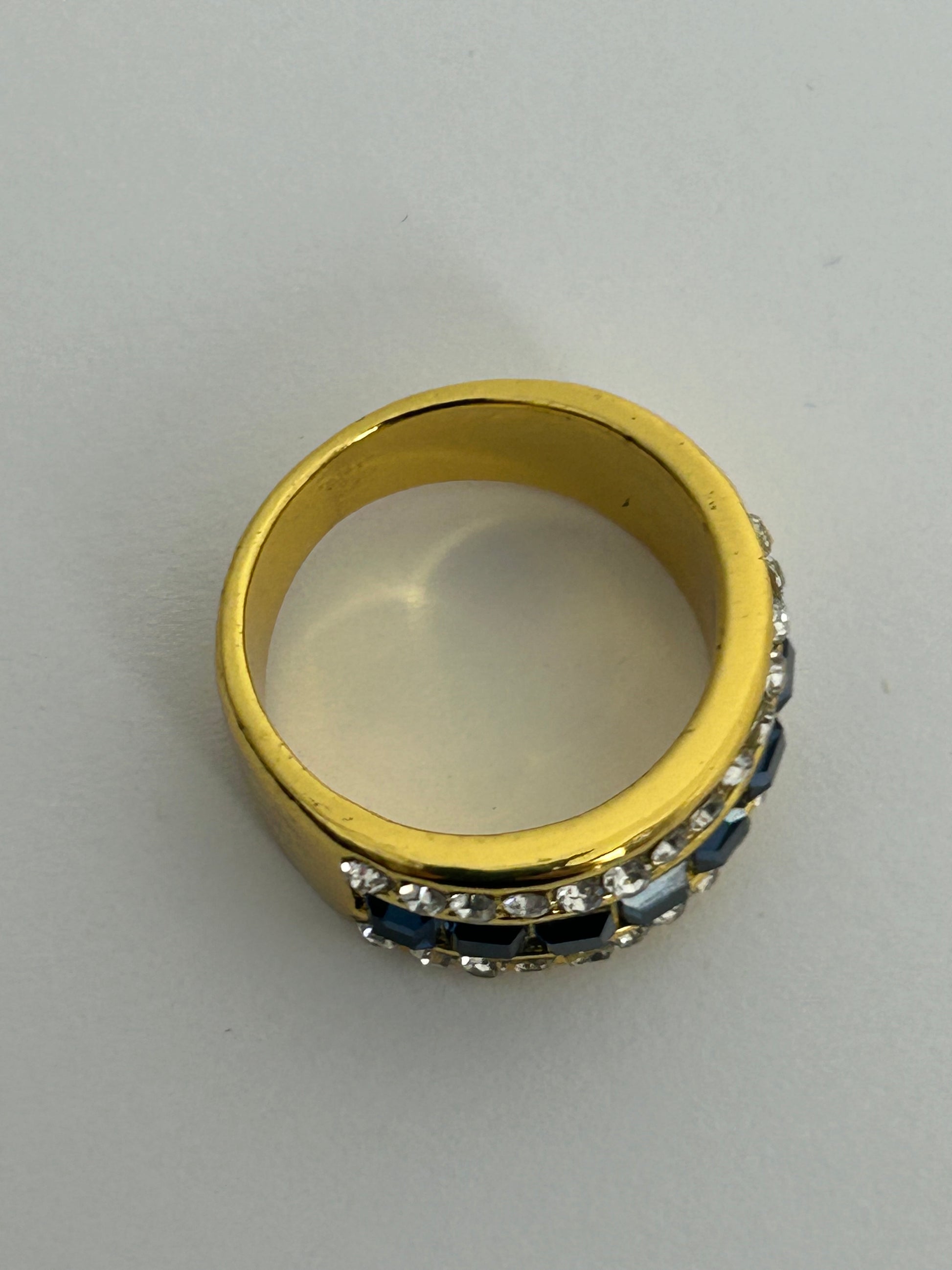 Vintage Gold Tone Base Metal Band Ring With Blue Stones & Diamantes Size P
