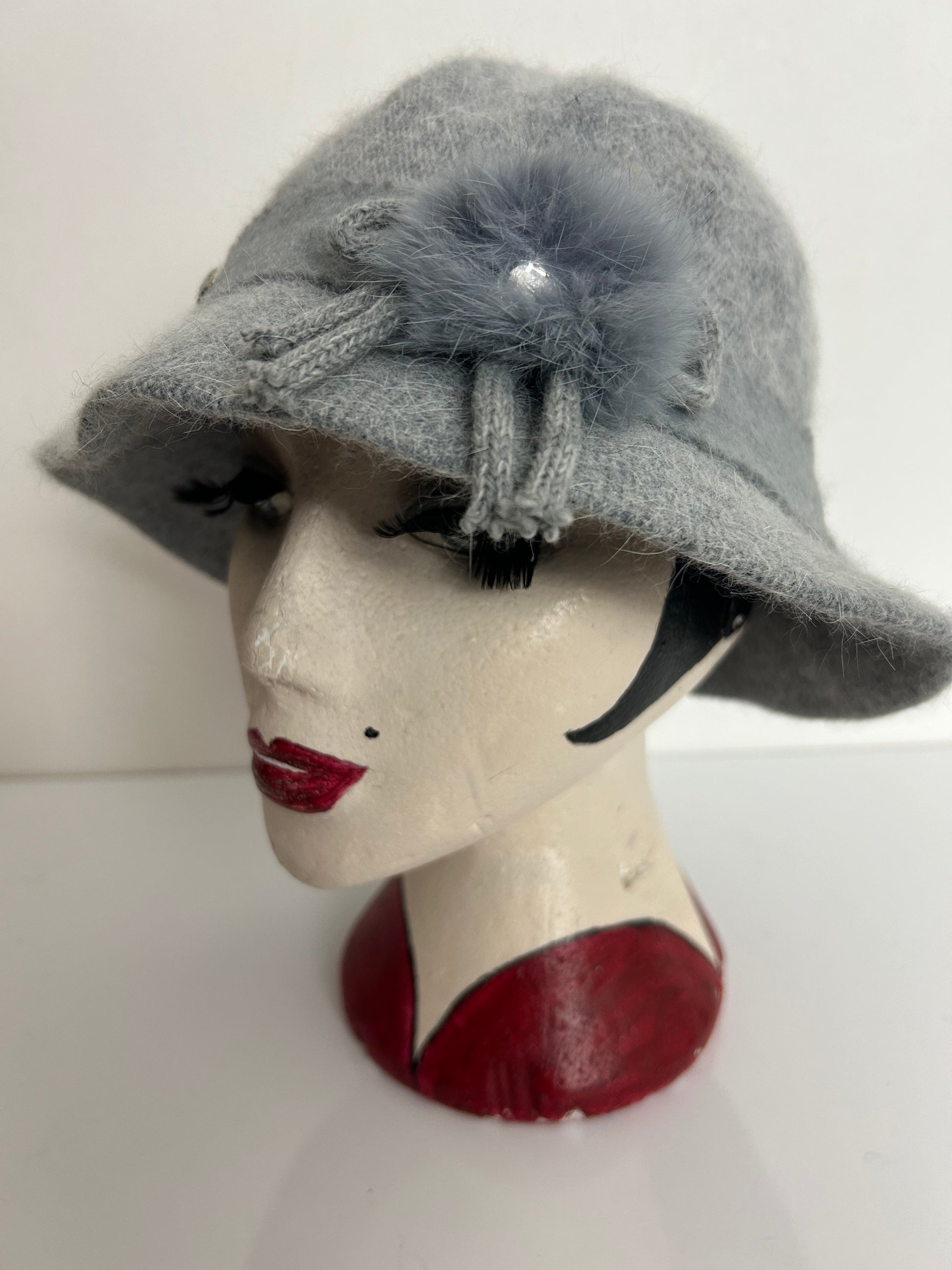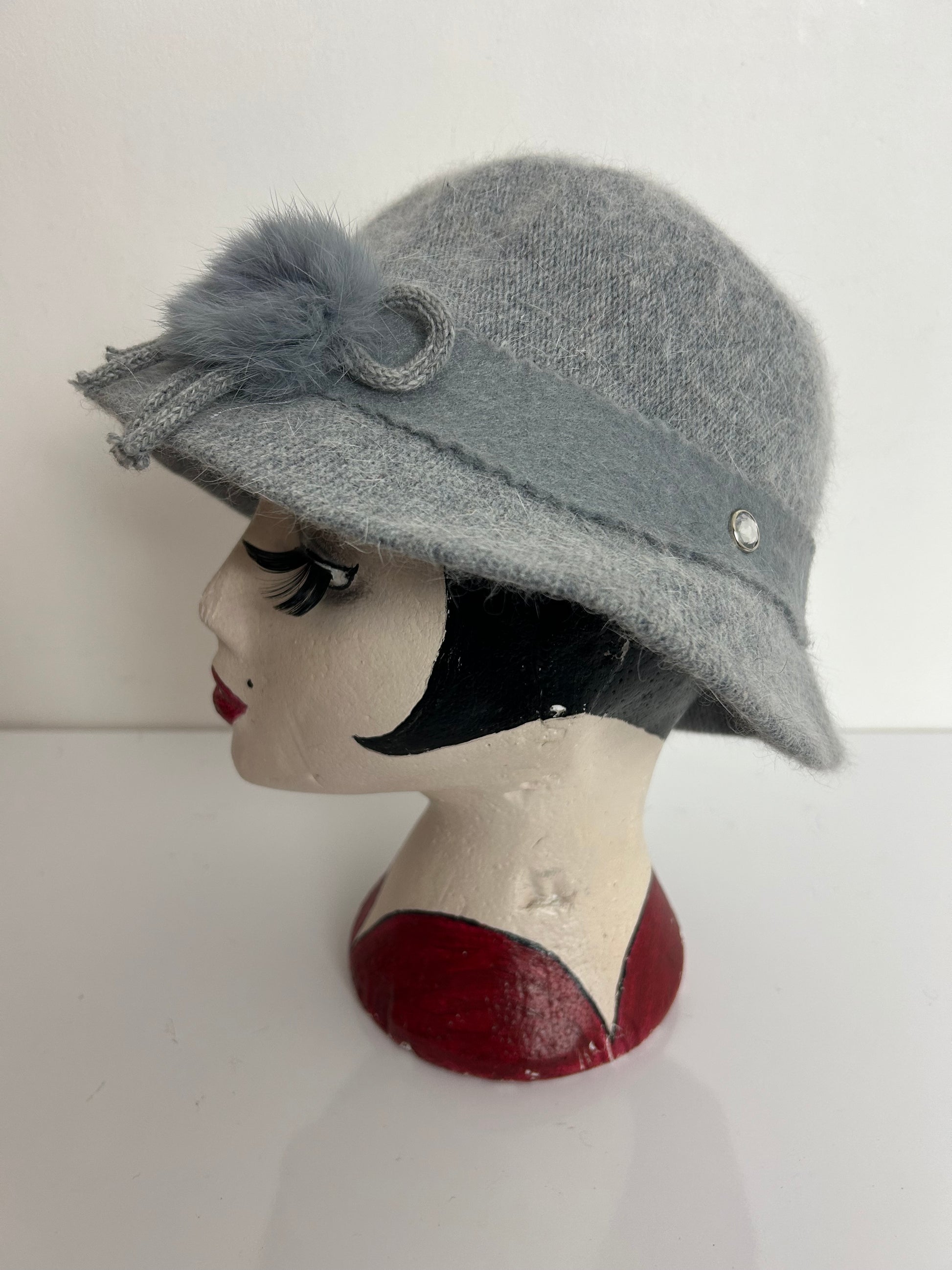 This lovely trilby style hat is made from a grey angora & wool mix.