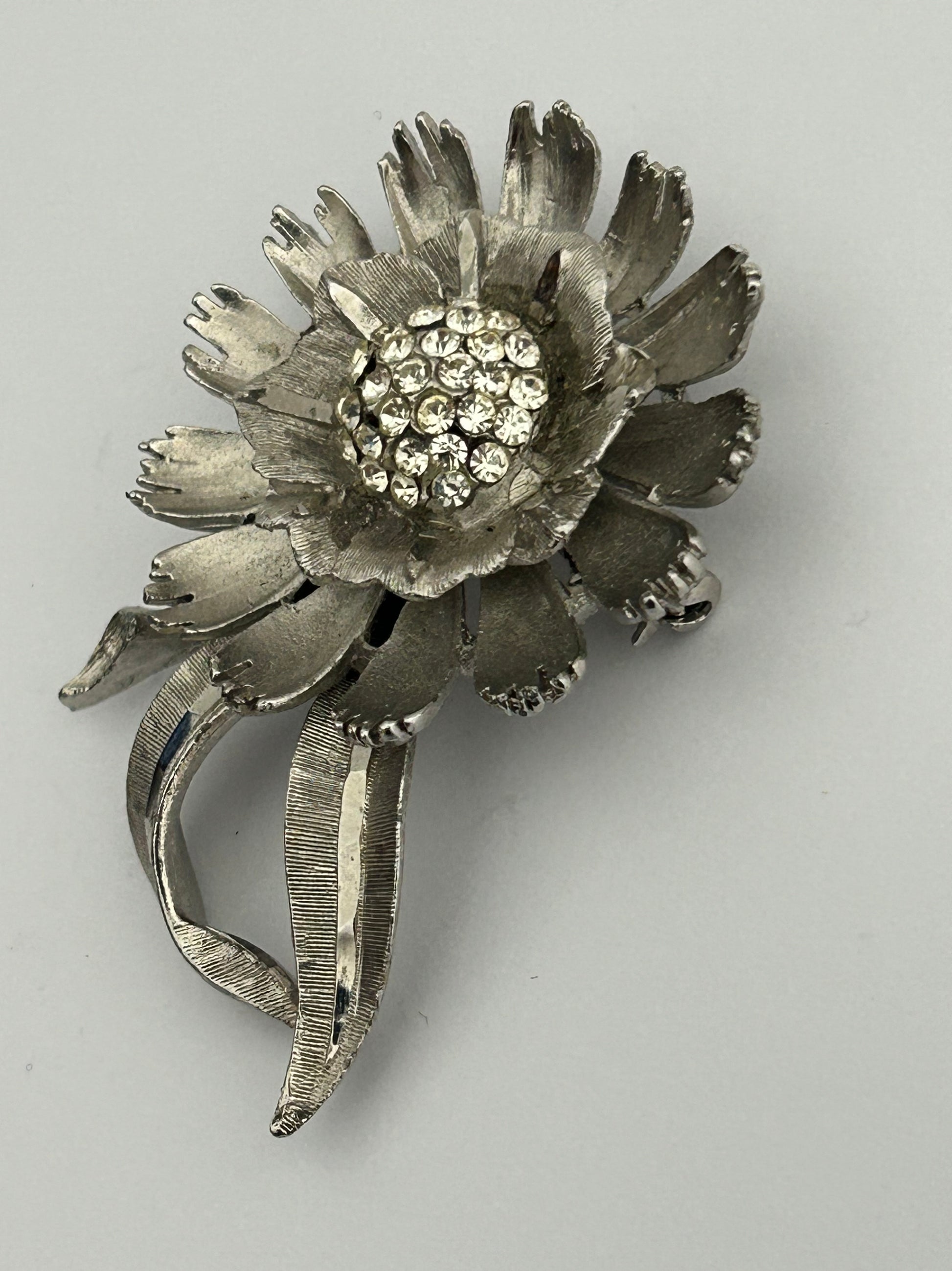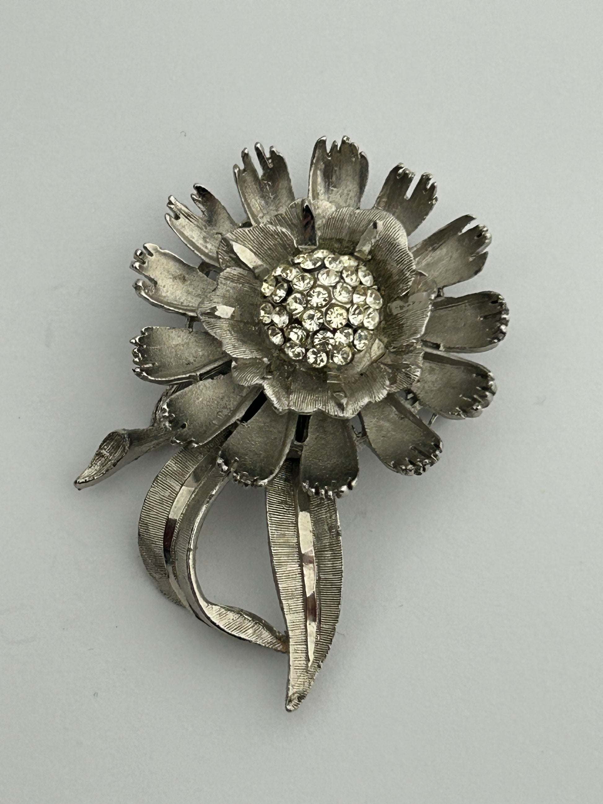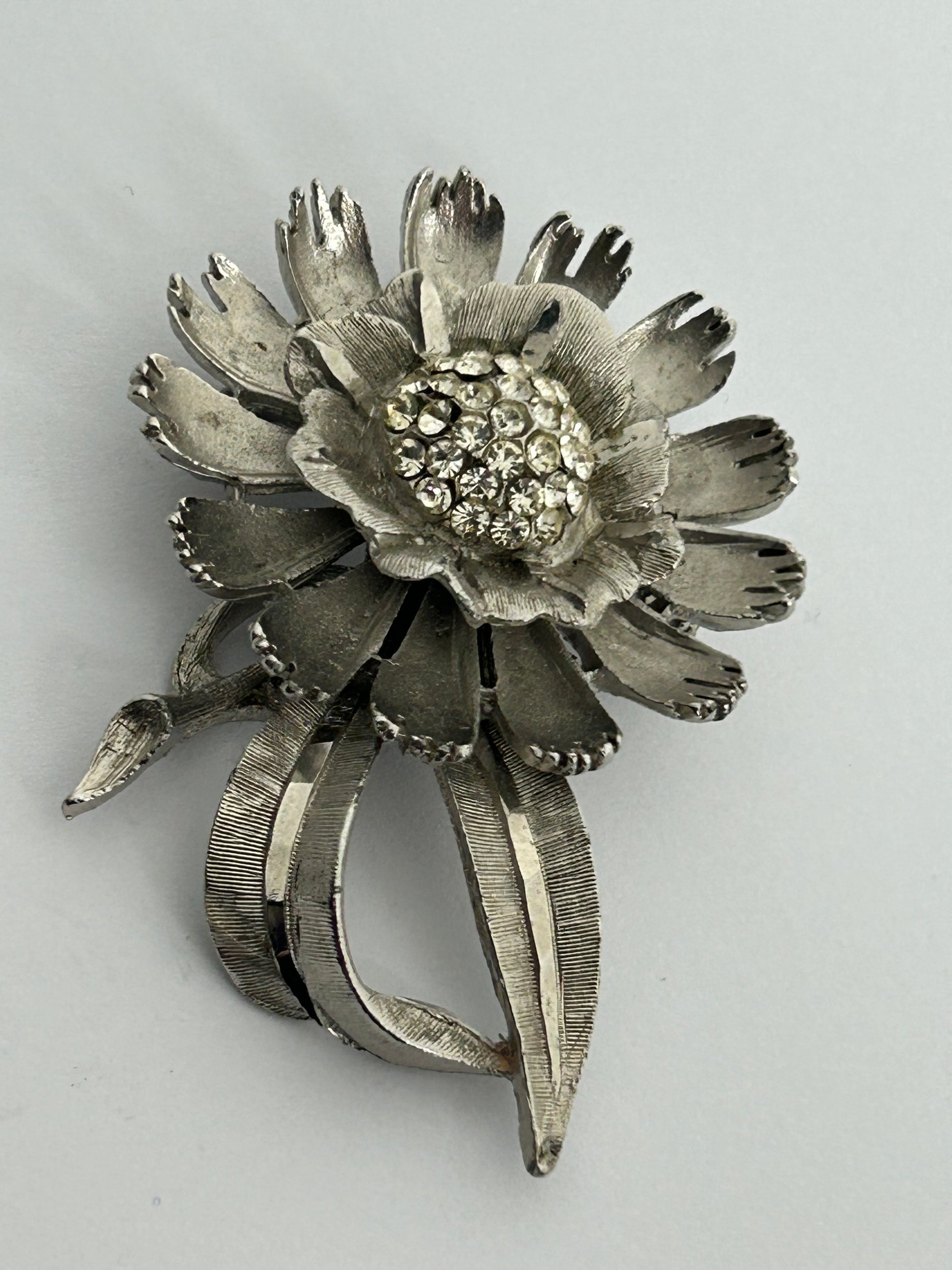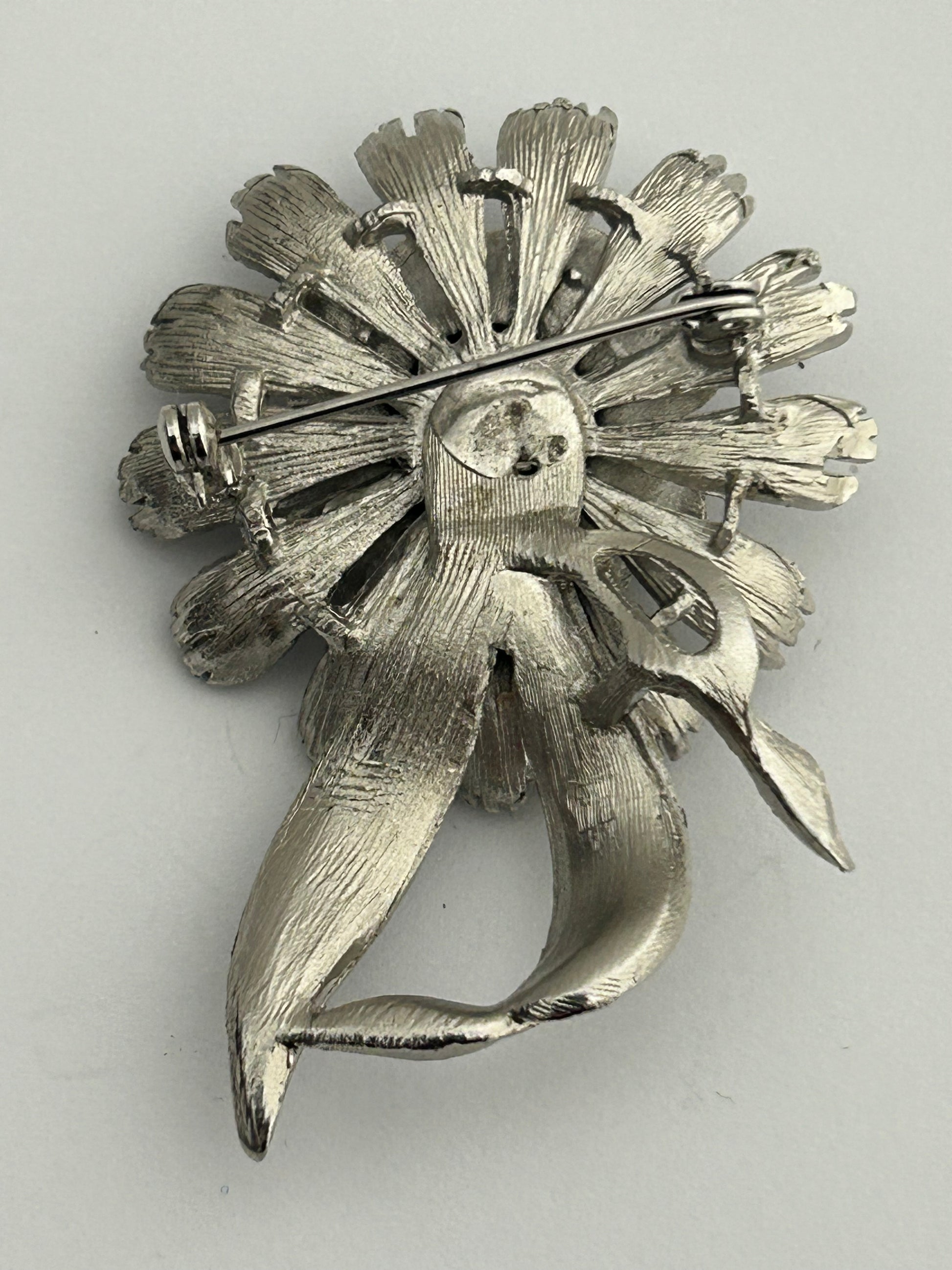 Vintage Large Silver Tone Base Metal Diamante Set Flower Pin Brooch