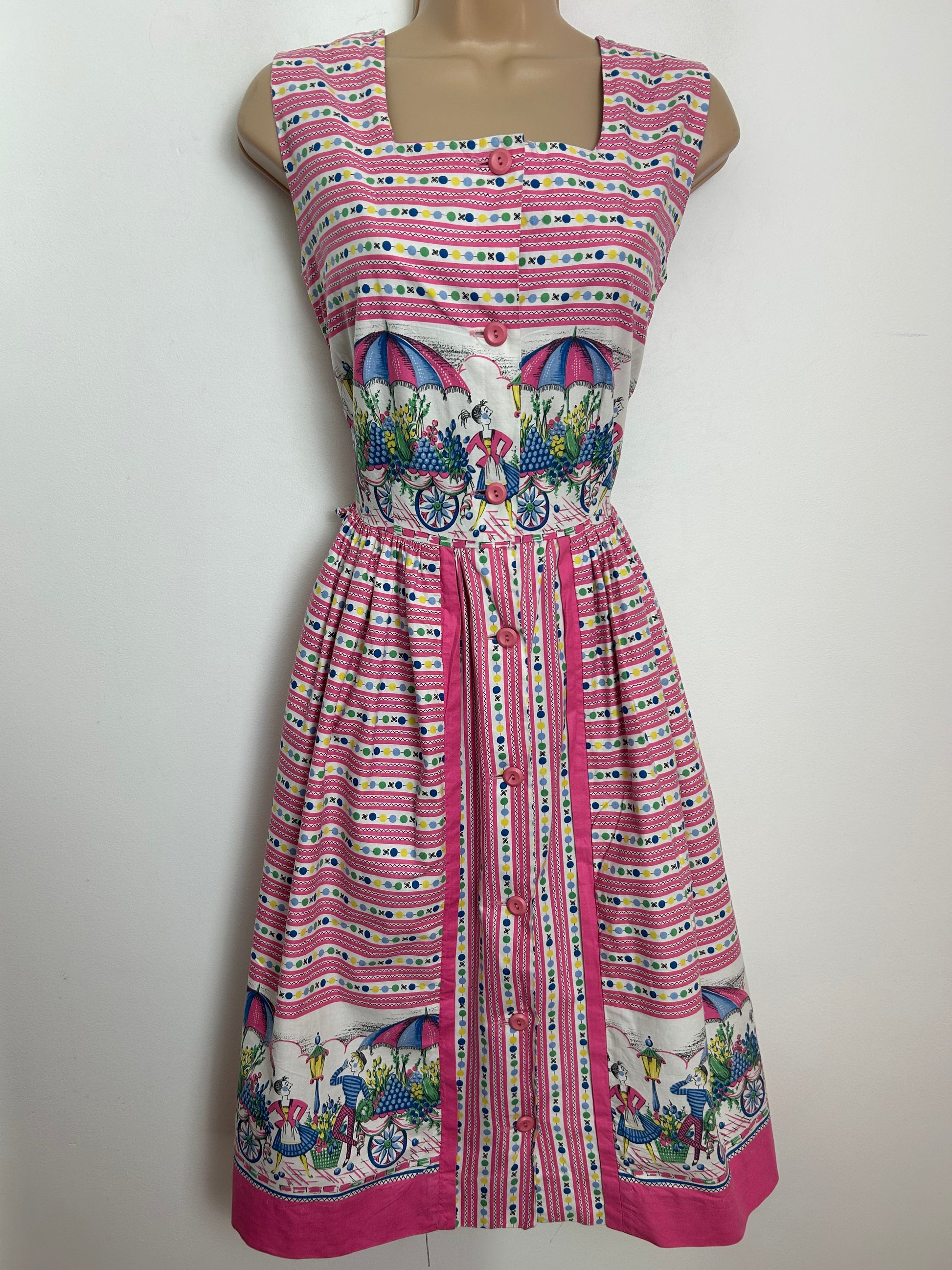 Vintage Late 1950s Early 1960s Size 8 Pink White & Blue Spot Stripe & Flower Stall Novelty Print Cotton Summer Day Dress