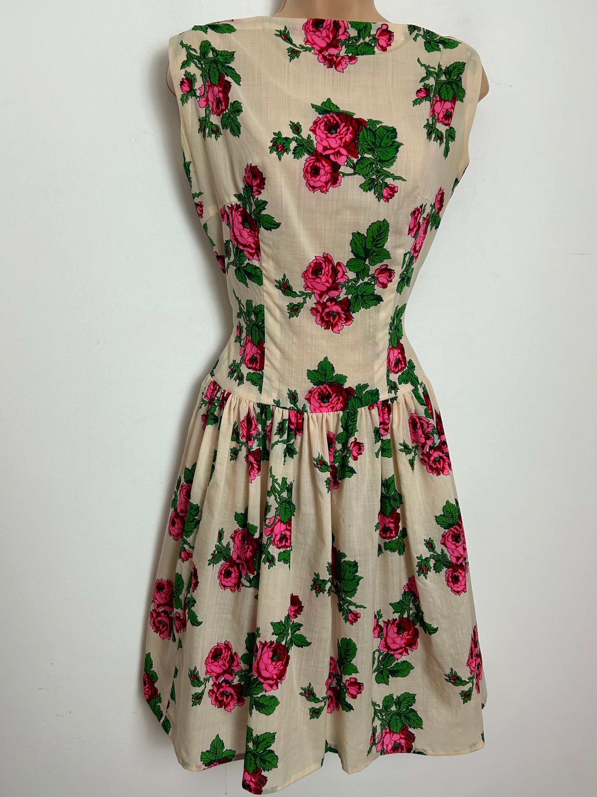 This pretty vintage dress is made from a cotton or cotton mix fabric in cream. With a pink & green rose floral print.