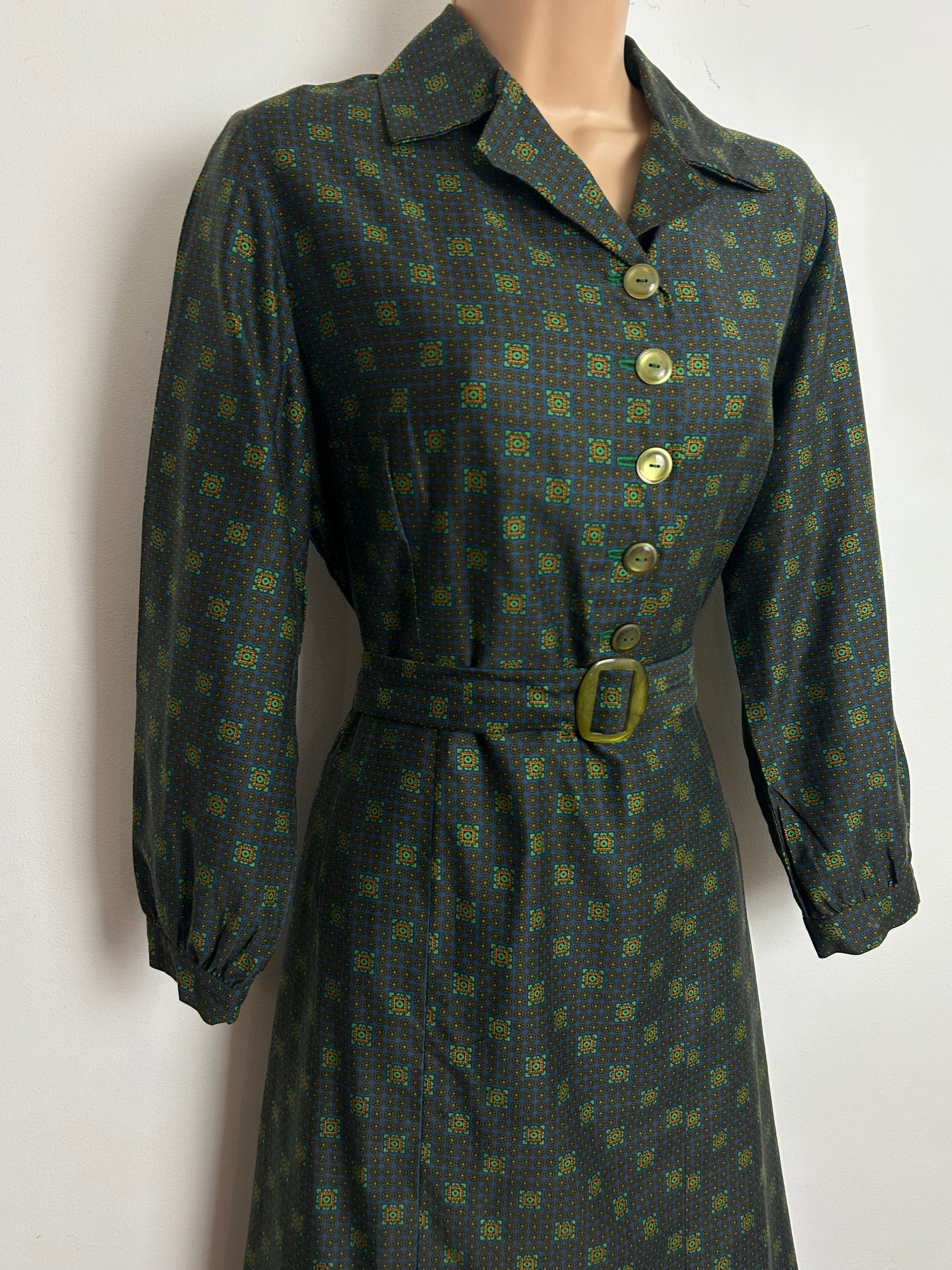 Vintage Late 1950s Size 14 Dark Green Tile Print Belted Cotton Pleat Detail Day Dress