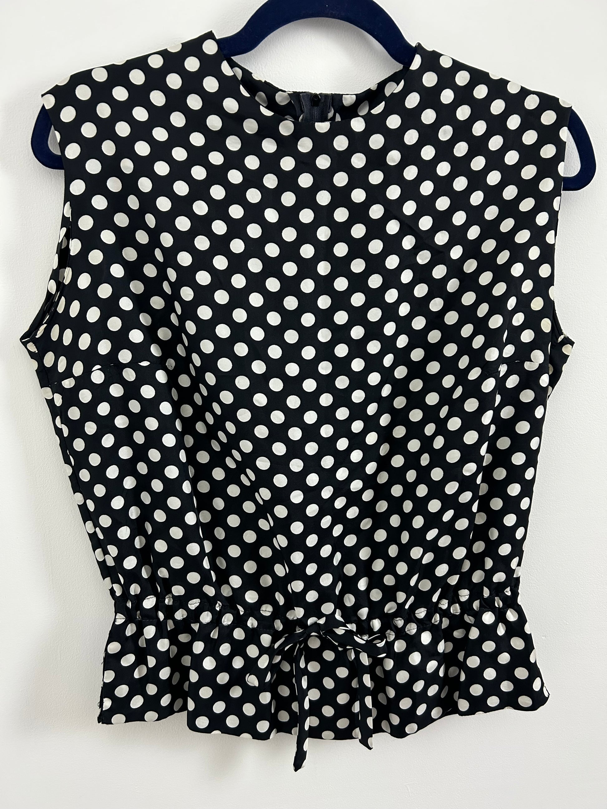 Vintage Late 1960s Size 12-14 Black & White Polka Dot Print Sleeveless Tie Detail Top