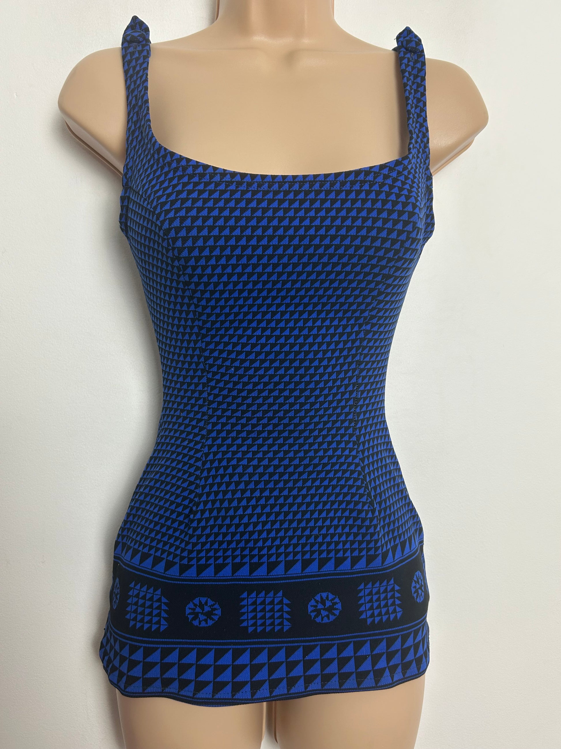 Vintage Late 1960s TROPIC Size 10-12 Dark Blue & Navy Geo Print Padded Skirted Swimsuit
