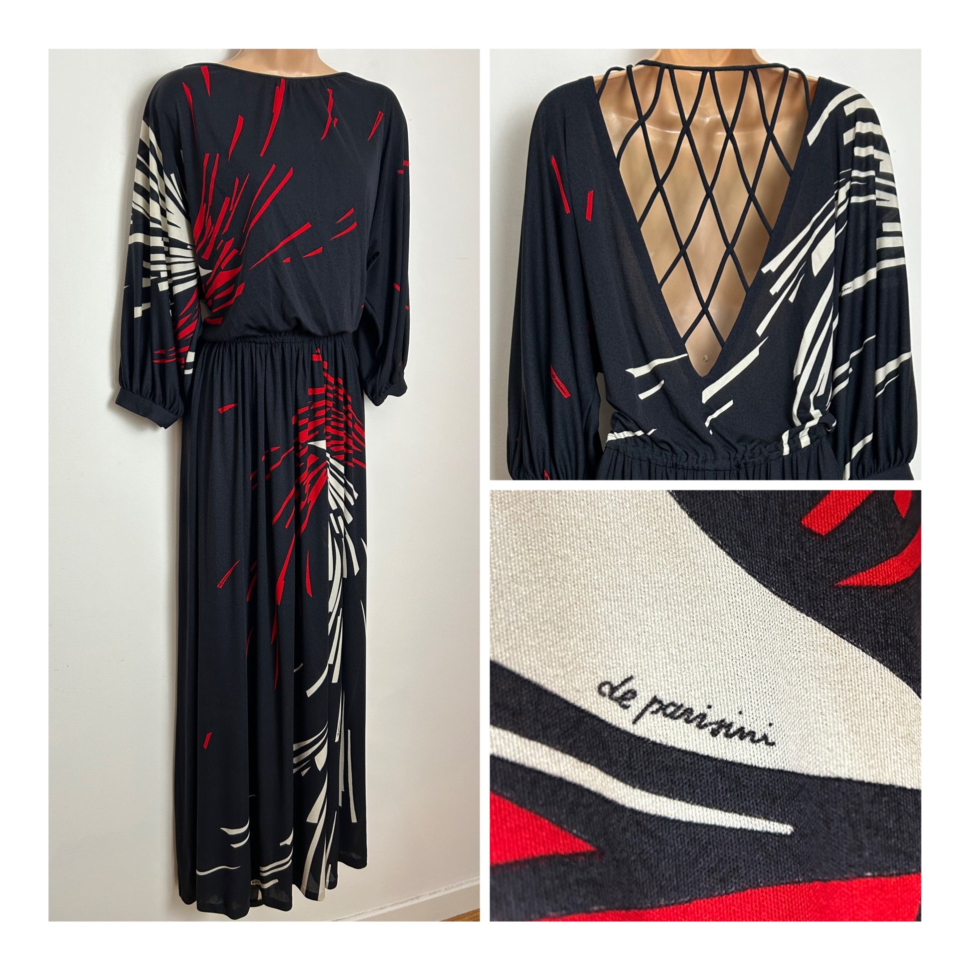 De Parisini was an Italian fashion house, prolific in the 1970s. Well known for their silk jersey dresses. Gianni Versace designed for them for a short while. They were also recognised for its use of bold prints and unique silhouettes, which this one definitely is!