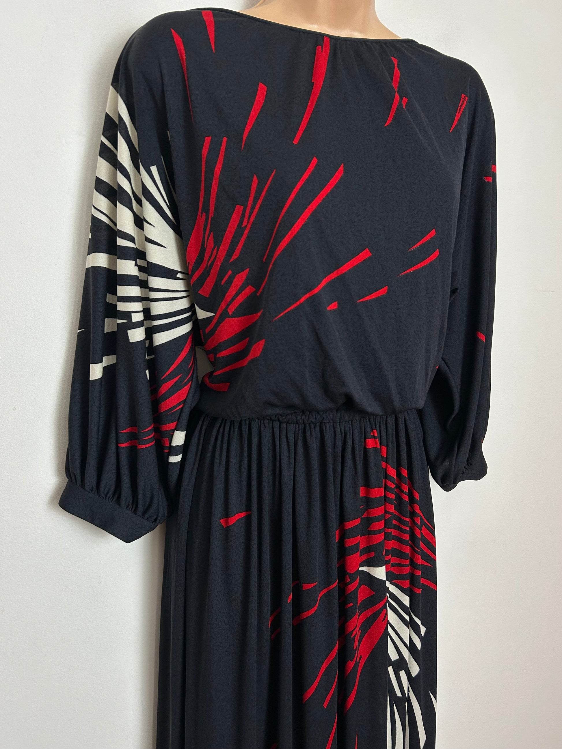 Vintage Late 1970s Rare DE PARISINI Size 12-14 Black White & Red Abstract Stripe Print Signed Silk Jersey Maxi Dress