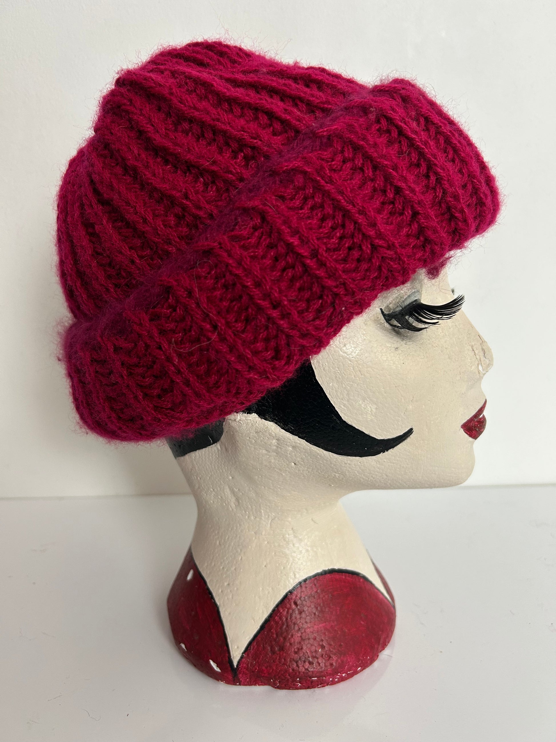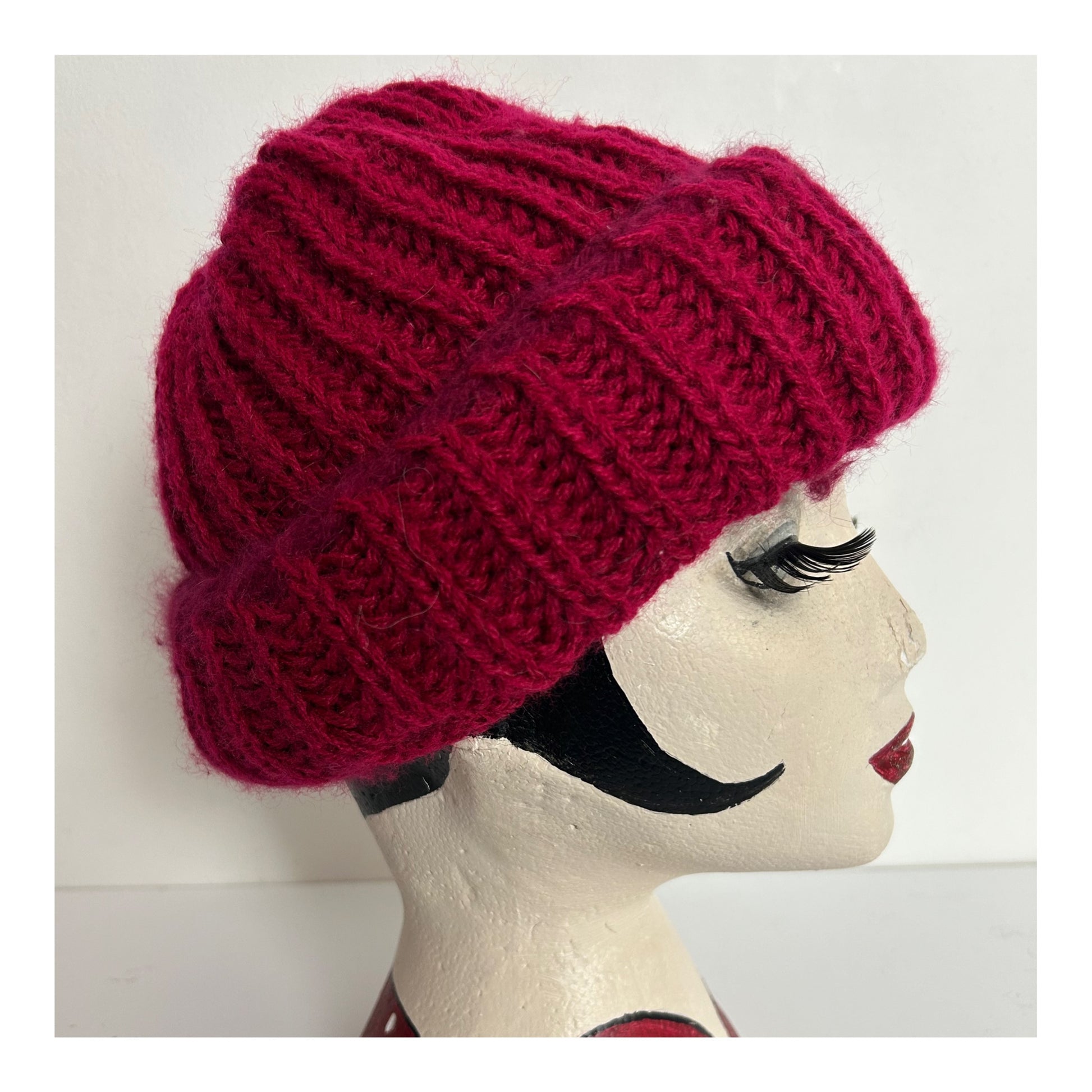 Vintage Raspberry Chunky Rib Knit Turn Up Angora & Wool Mix Beanie Style Hat