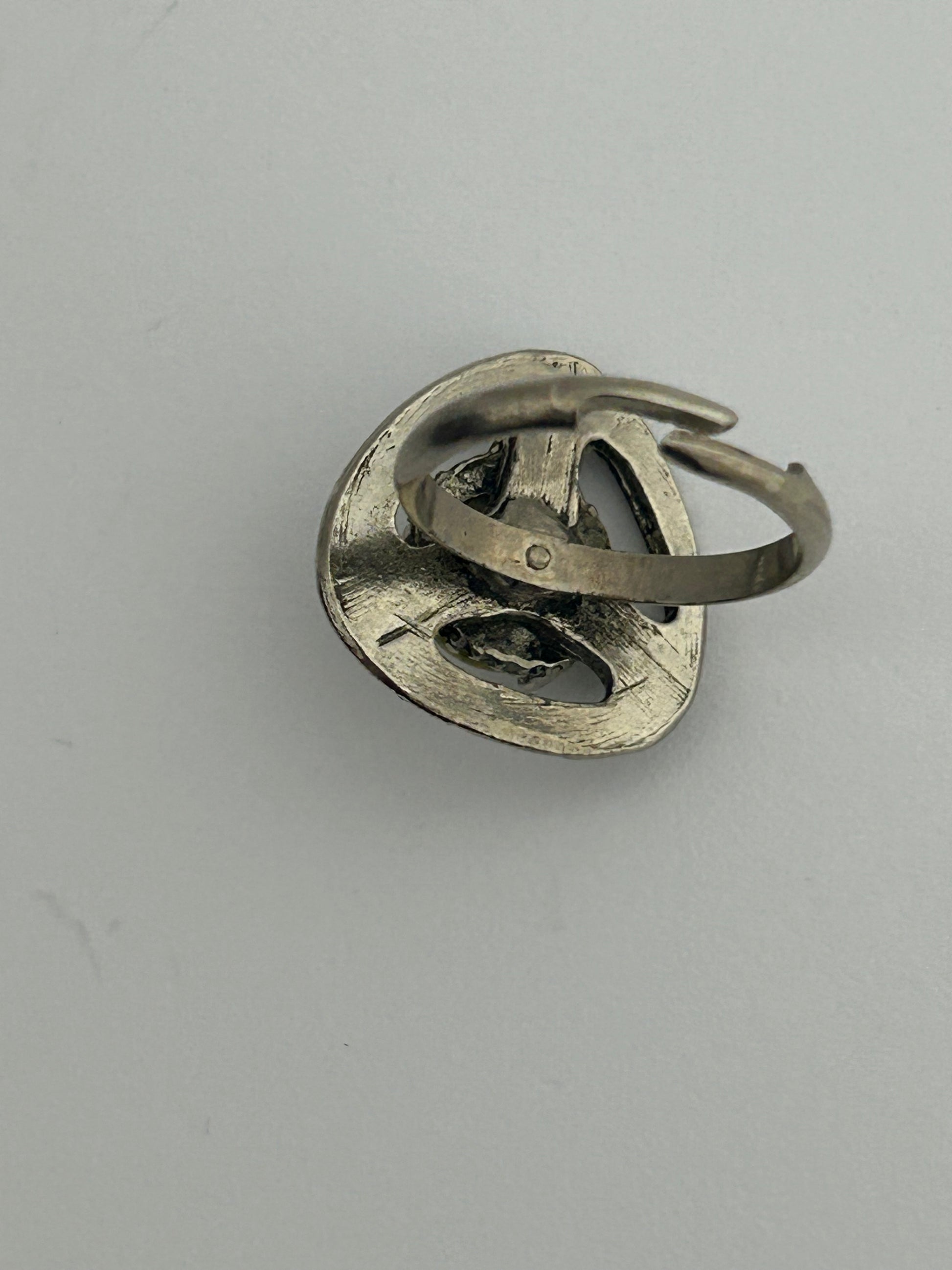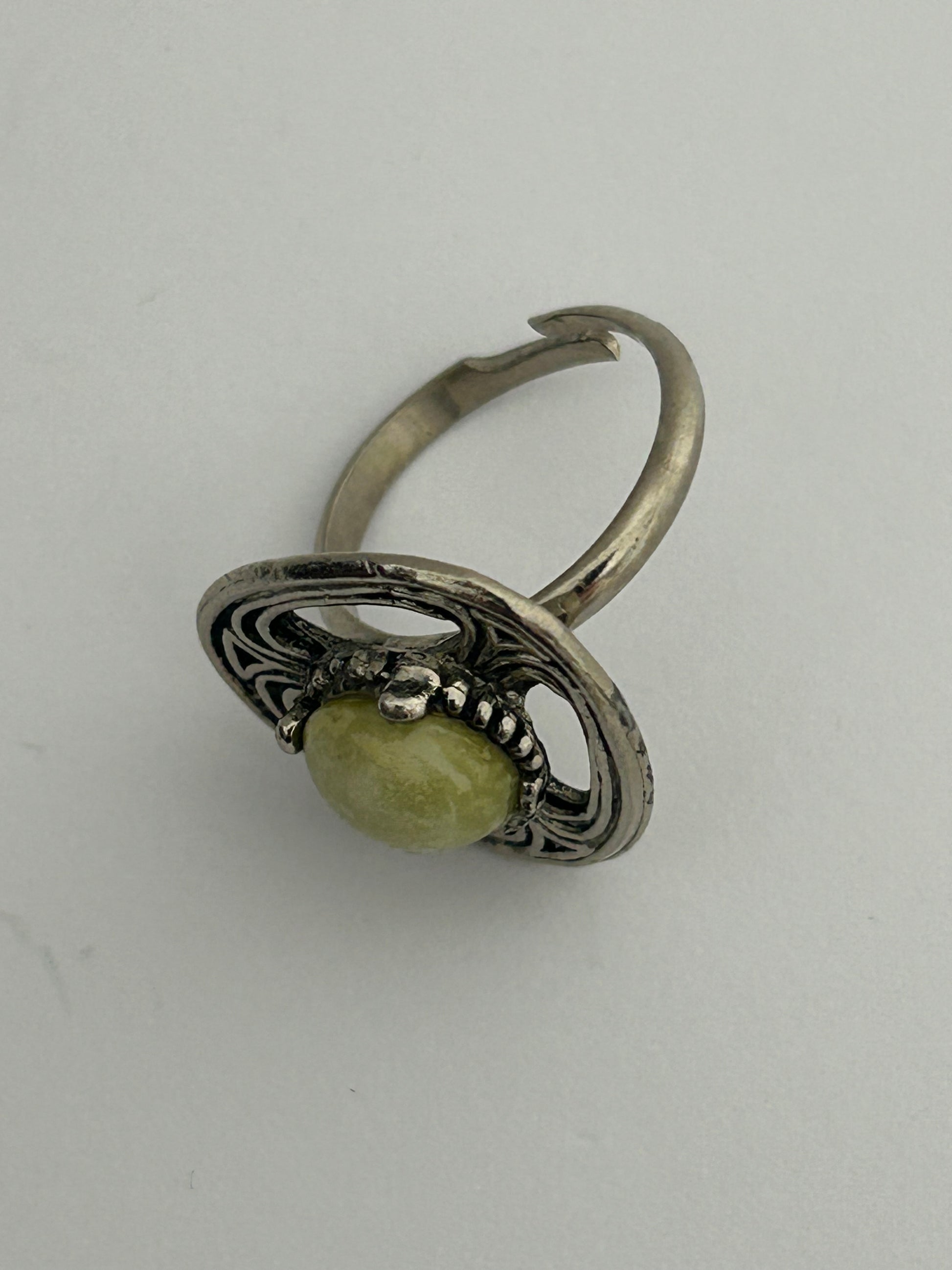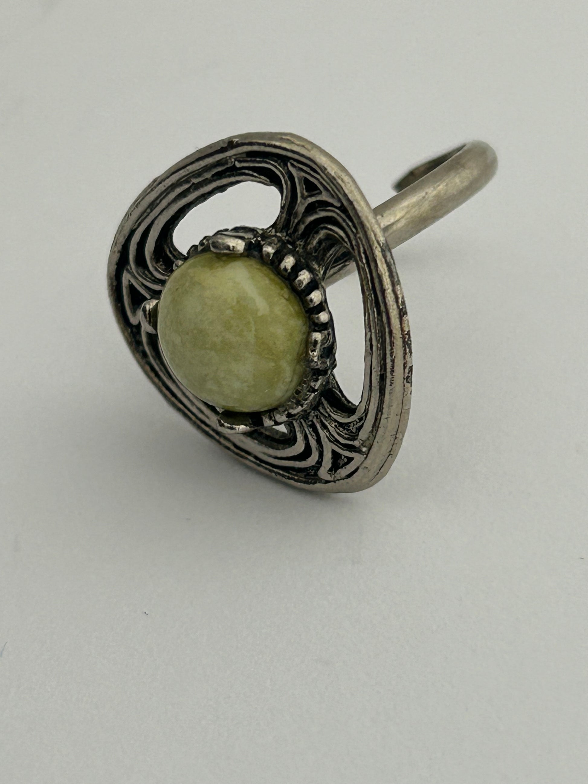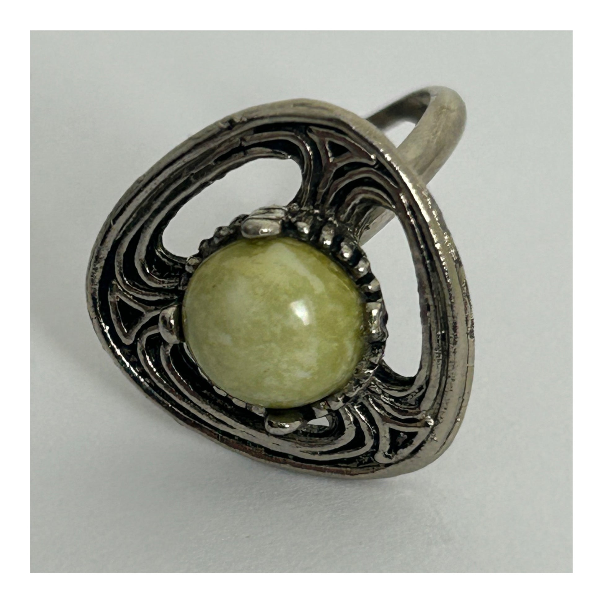 Vintage Silver Tone Base Metal & Green Stone Set Scottish Celtic Style Adjustable Ring Size Q