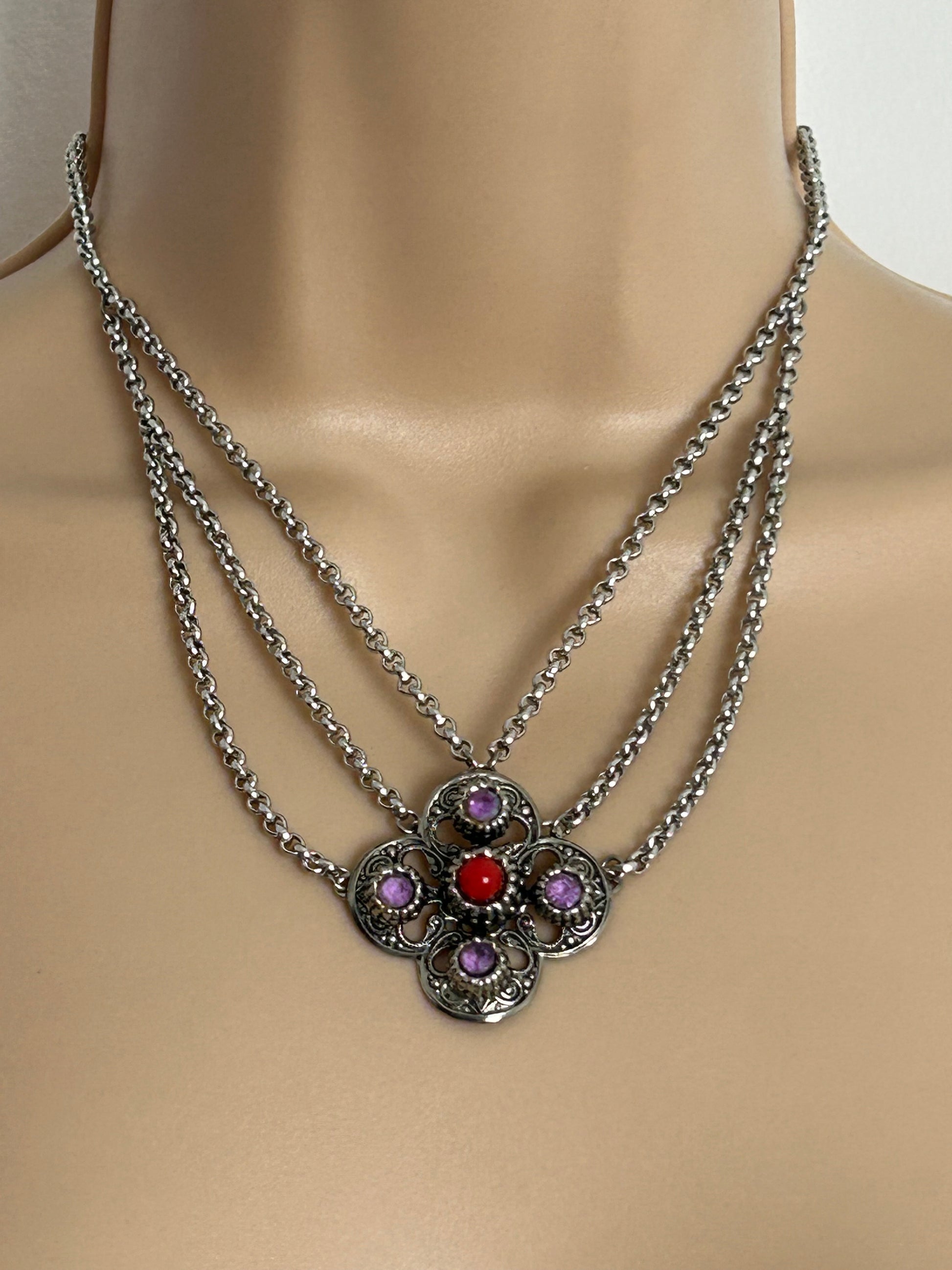 Vintage Silver Tone Base Metal Lilac & Red Stone Set Triple Chain Scottish Celtic Style Necklace