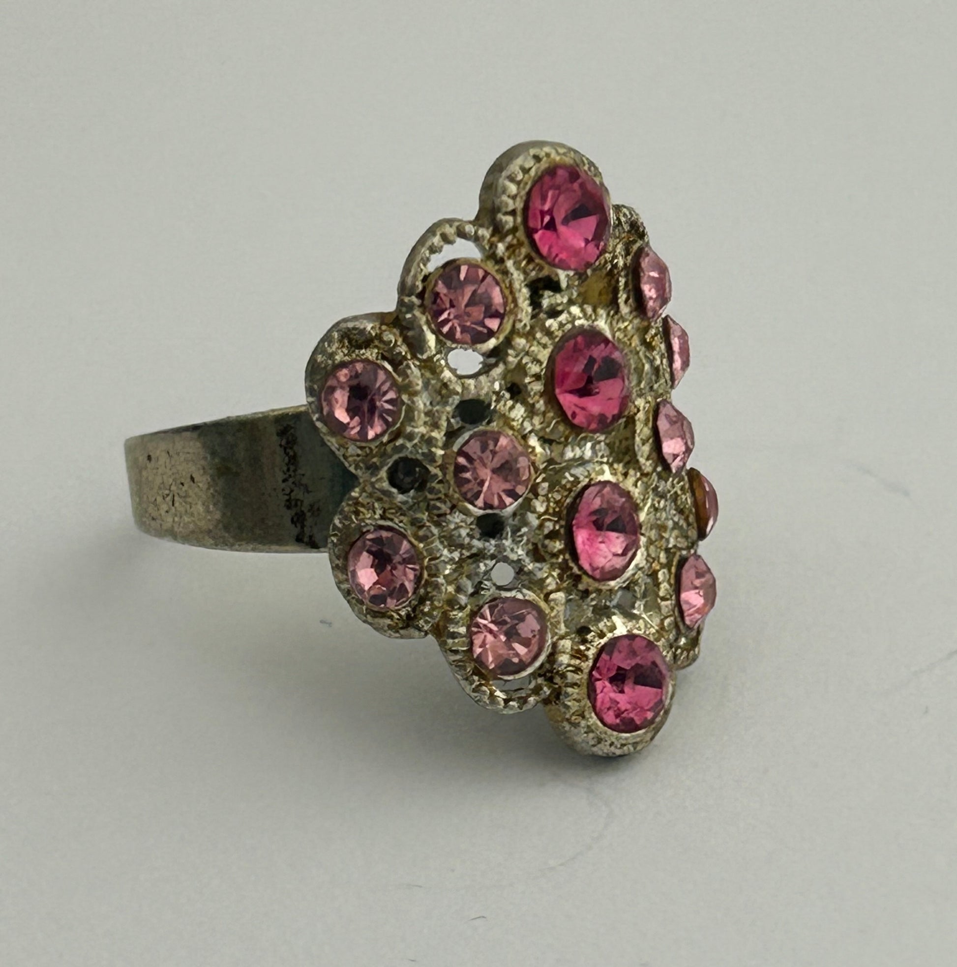 Vintage Silver Tone Metal & Purple Pink Diamante Stone Set Adjustable Ring Up To UK Size U