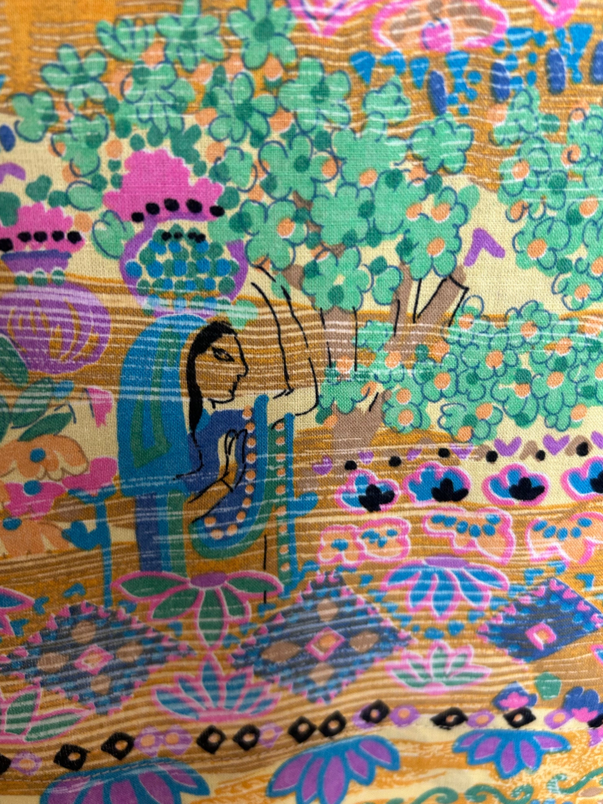 In a beige orange pink green & blue exotic secret garden novelty print. Featuring people, trees, birds & tigers.